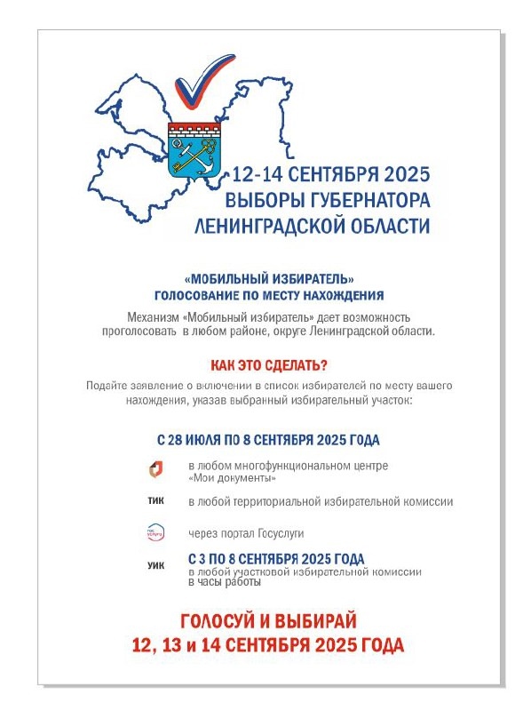 Голосование на выборах Губернатора Ленинградской области пройдет 12, 13, 14 сентября 2025 года.